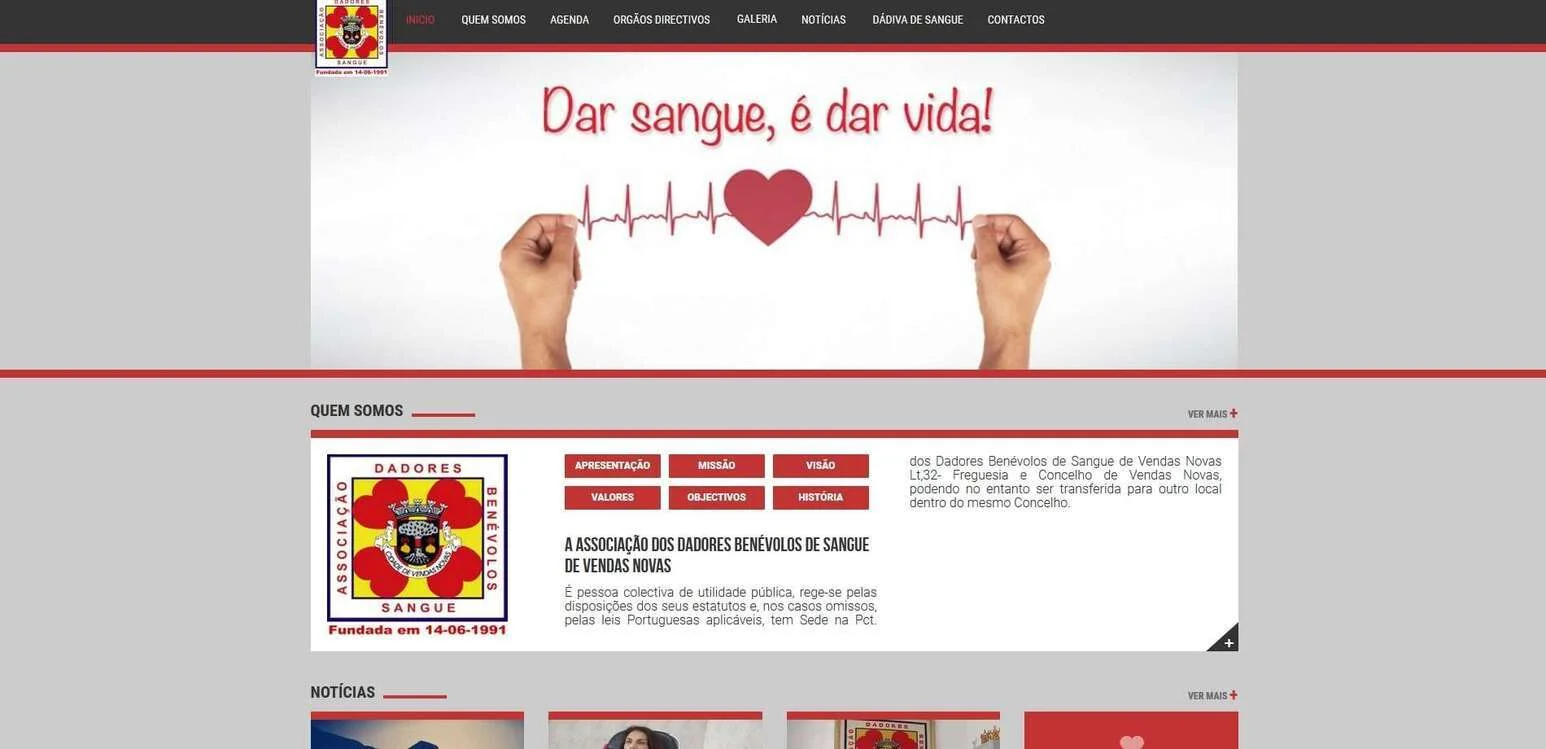 Página informativa de apresentação, calendarização de eventos e contactos da Associação de Dadores de Sangue de Vendas Novas